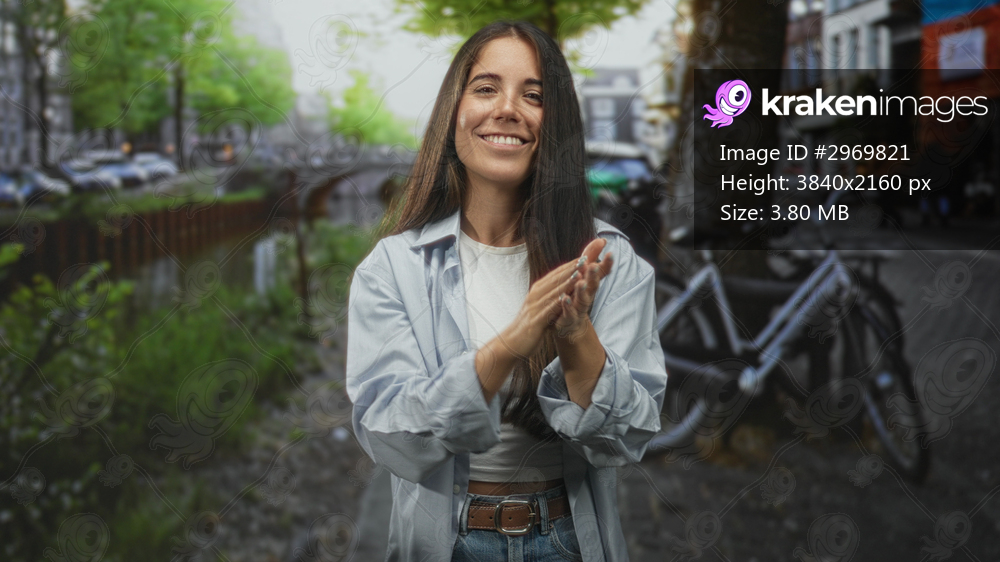 Young hispanic woman clapping hands and smiling, bare midriff visible, standing on a street beside a canal with parked bicycle and trees; joy celebration. - Kraken Images