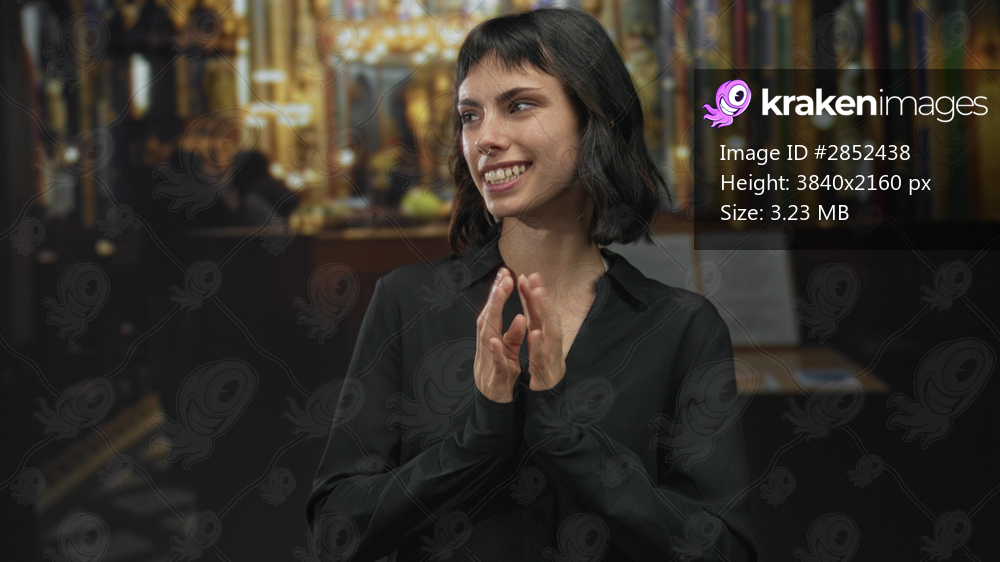 Young hispanic woman clasp hands for prayer in church surrounded by blurred golden altar and candles; serenity.