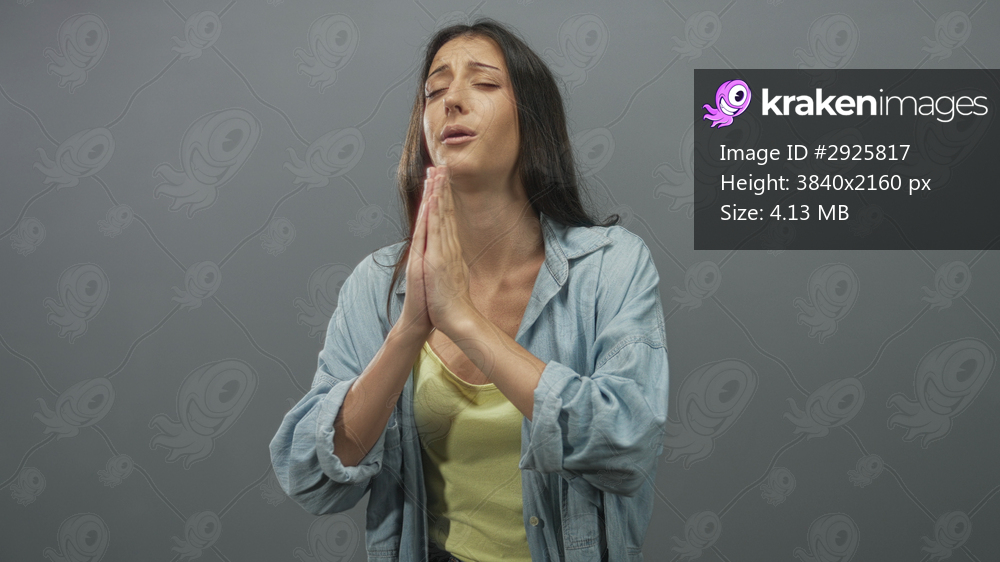 Young hispanic woman with clasped hands and closed eyes praying in a studio with gray backdrop wearing yellow tank top; hope prayer.