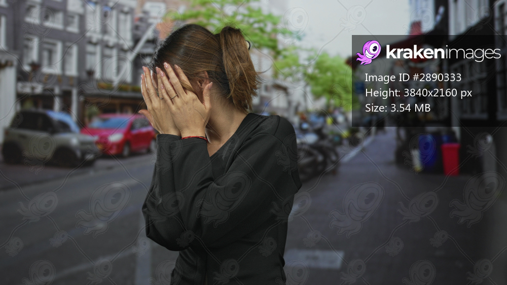 Young hispanic woman clasping hands to chest on a busy city street with parked cars and bicycles visible; fear caution.