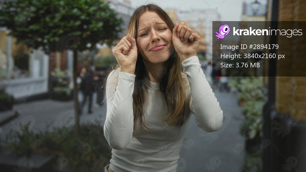 Young hispanic woman with clenched fists near face showing a pained pout on a busy street lined with planters and brick buildings; playful frustration. - Kraken Images