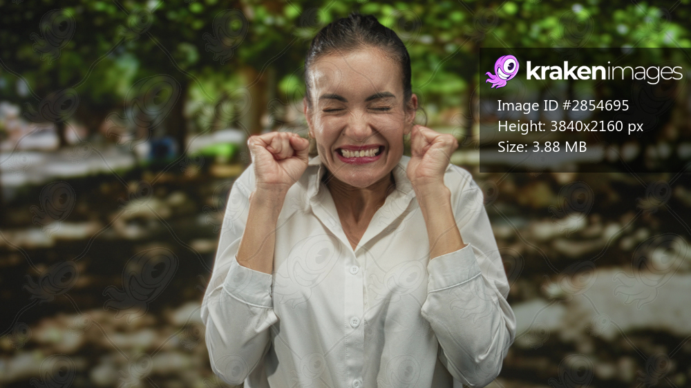Young hispanic woman with clenched fists raised in green park outdoors, celebrating a joyful moment; excitement.