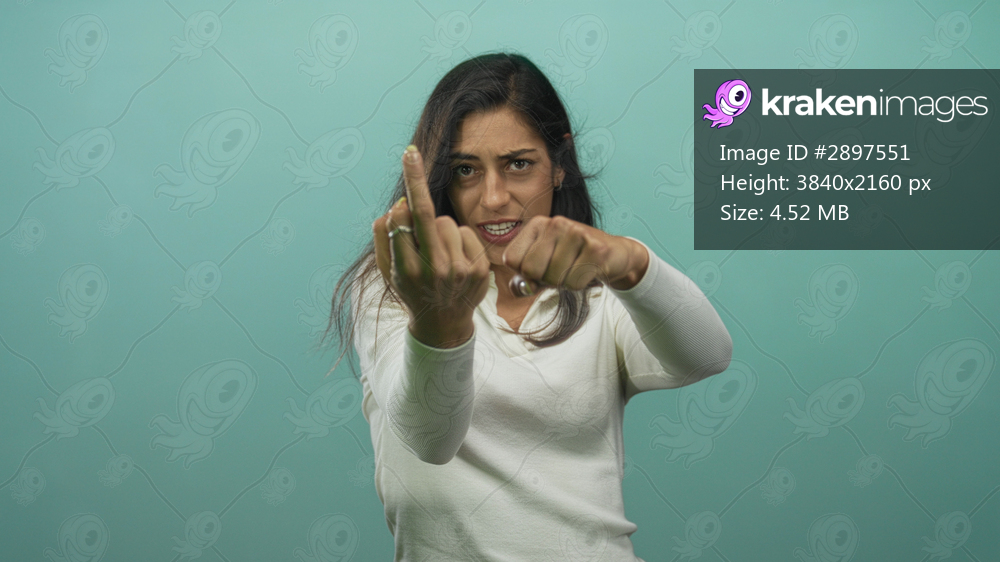Young hispanic woman with clenched fists and raised middle finger in teal studio, wearing white long sleeve top and rings; anger defiance.