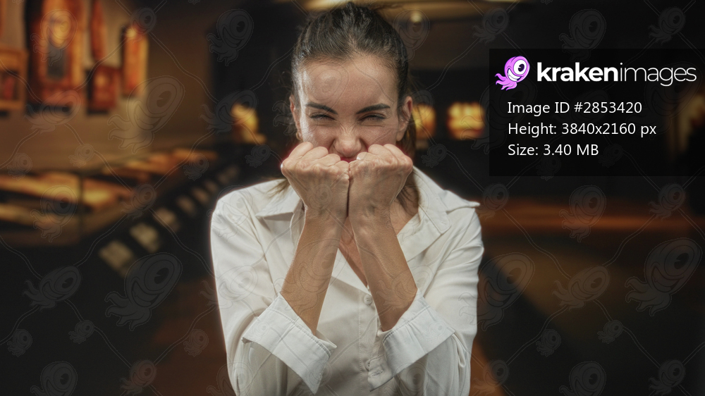 Young hispanic woman clenches fists and frowns while standing in dimly lit art gallery building hallway lined with framed paintings; anger.