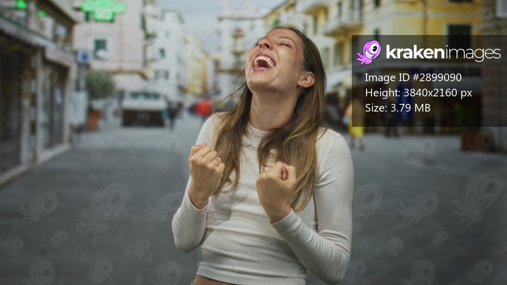 Young hispanic woman clenches fists and throws head back in a joyful shout on a crowded city street, smiling with closed eyes; triumph celebration.