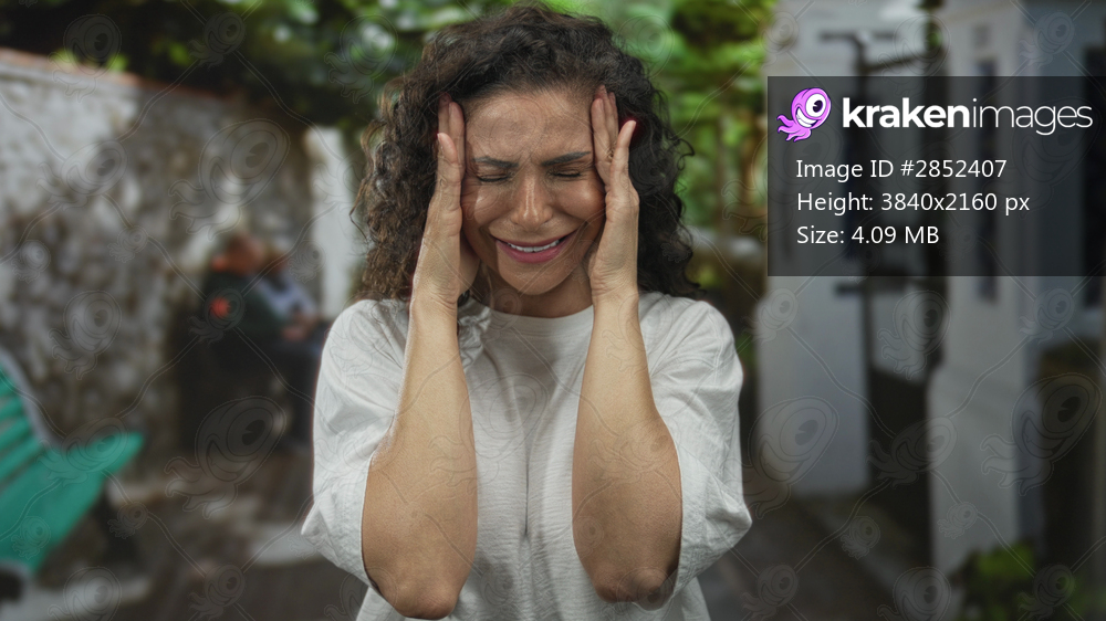 Young hispanic woman with closed eyes and furrowed brow holds temples for headache on sunlit street; tension.