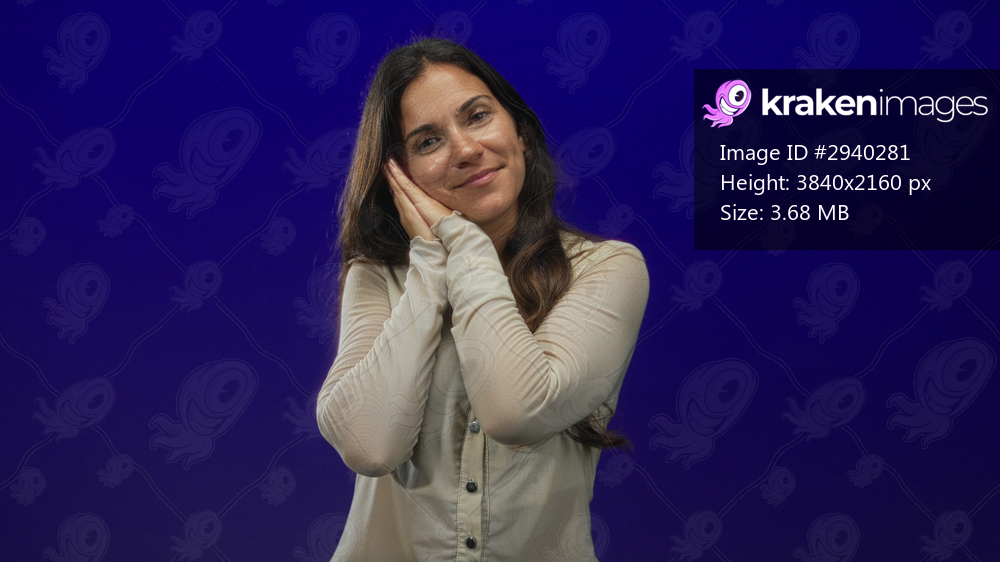 Young hispanic woman with closed eyes and hands pressed to cheek resting head in studio against deep blue wall; serenity.