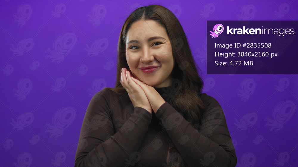 Young hispanic woman with closed eyes smiling and hands clasped under chin gesture in studio setting; serenity.