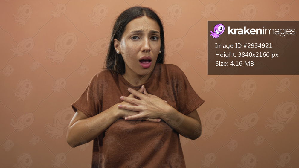 Young hispanic woman clutch chest in peach studio backdrop with hands pressed to chest and open mouth suggesting heartattack; anxiety shock vulnerability. - Kraken Images