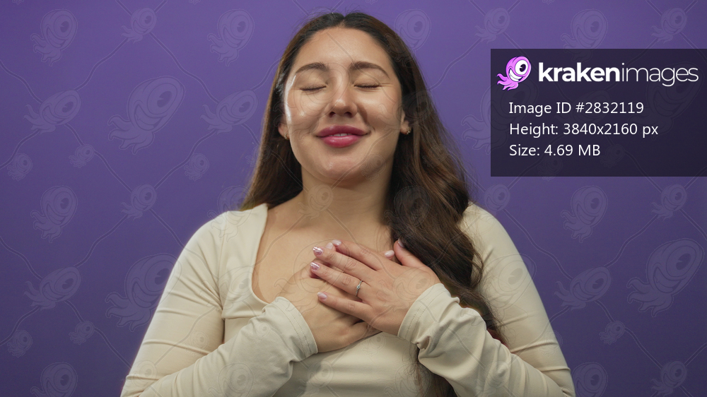 Young hispanic woman clutch chest smiling with closed eyes in vibrant purple studio setting; gratitude.