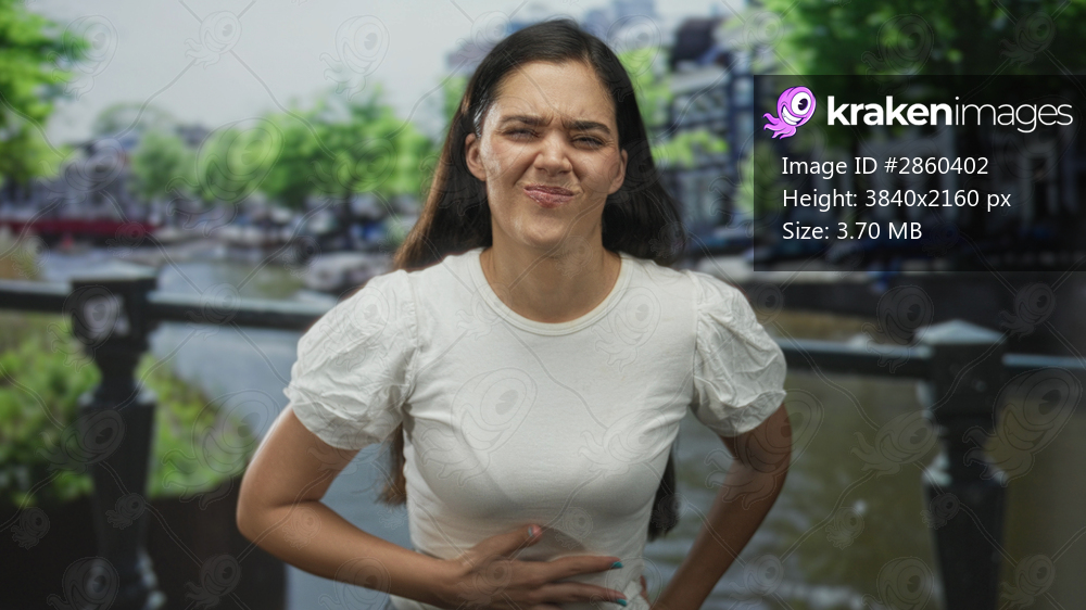 Young hispanic woman clutching abdomen with grimace along historic canal street in amsterdam; discomfort.