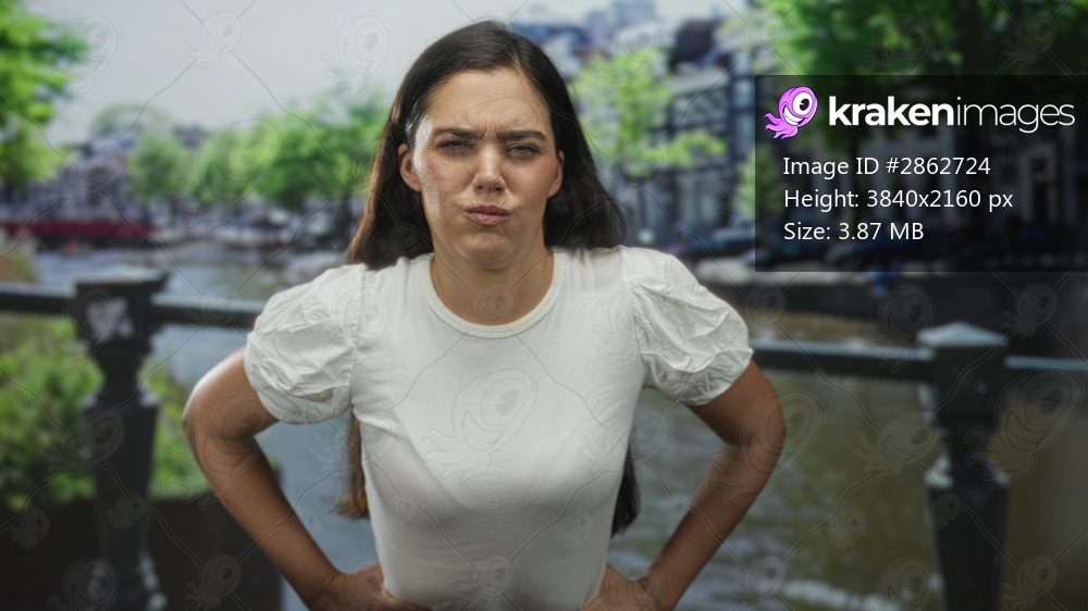 Young hispanic woman clutching abdomen with grimace along historic canal street in amsterdam; discomfort.