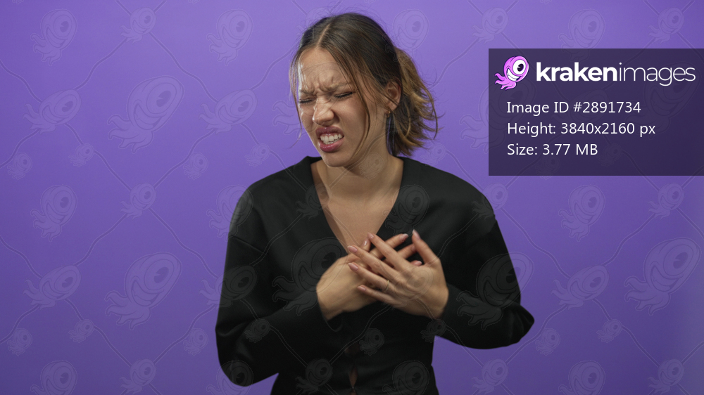 Young hispanic woman clutching chest with hands in purple studio midshot wearing black after heartattack; pain.