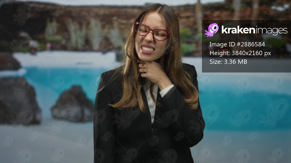 Young hispanic woman clutching neck with hand at hotel pool outdoors, grimacing in blazer for throat pain; pain.