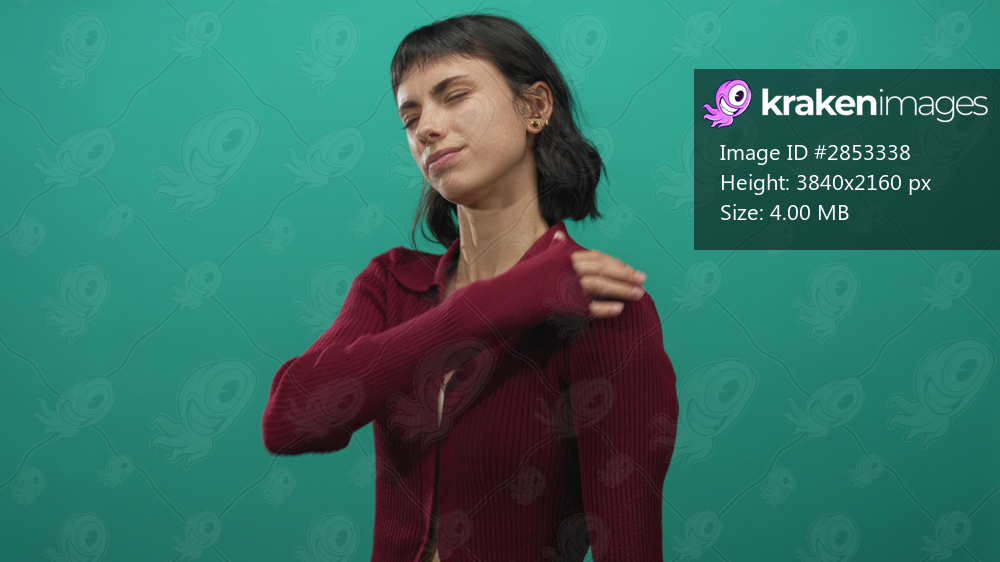 Young hispanic woman clutching right shoulder in green studio setting showing muscle strain and discomfort; distress.