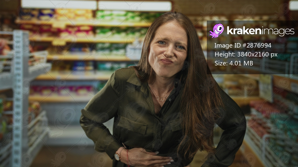 Young hispanic woman clutching stomach with hand in supermarket aisle among shelves and products; pain urgency.
