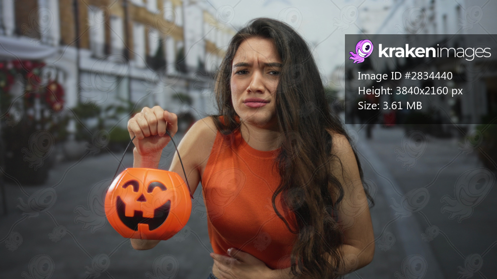 Young hispanic woman clutching stomach with one hand and holding pumpkin bucket on street; discomfort.