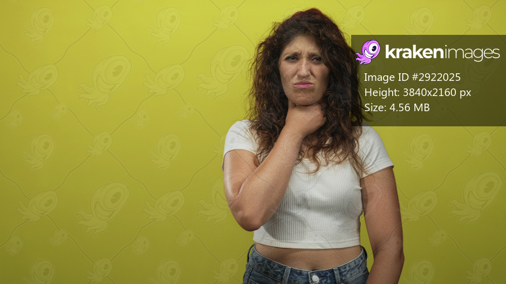 Young hispanic woman clutching throat with hand, white crop top and jeans showing bare midriff in yellow studio; throat pain.