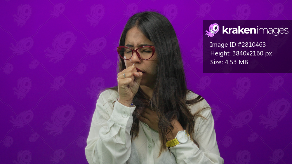 Young hispanic woman coughing over isolated purple background wall, expressing discomfort with red glasses and a white shirt, showcasing health and illness concepts vividly. - Kraken Images
