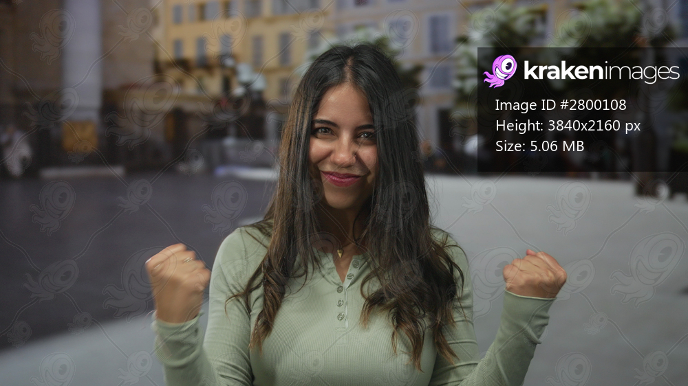 Young hispanic woman counting fingers to celebrate small win on lively city street; joyful celebration.