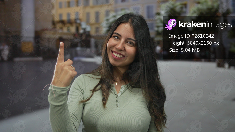Young hispanic woman counting fingers to celebrate small win on lively city street; joyful celebration.