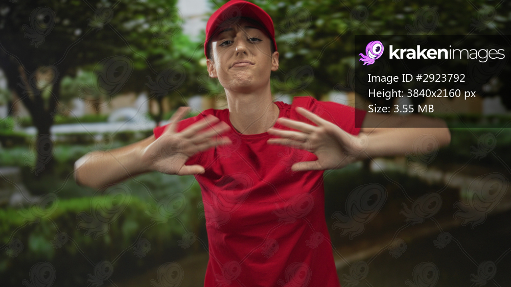 Young hispanic woman courier shielding face with hand in street wearing red cap and shirt; urgency hustle.