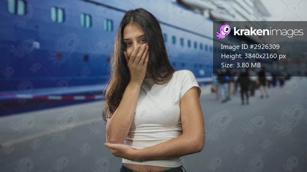 Young hispanic woman covering face with hand at port pier beside a docked cruise ship; embarrassment waiting.