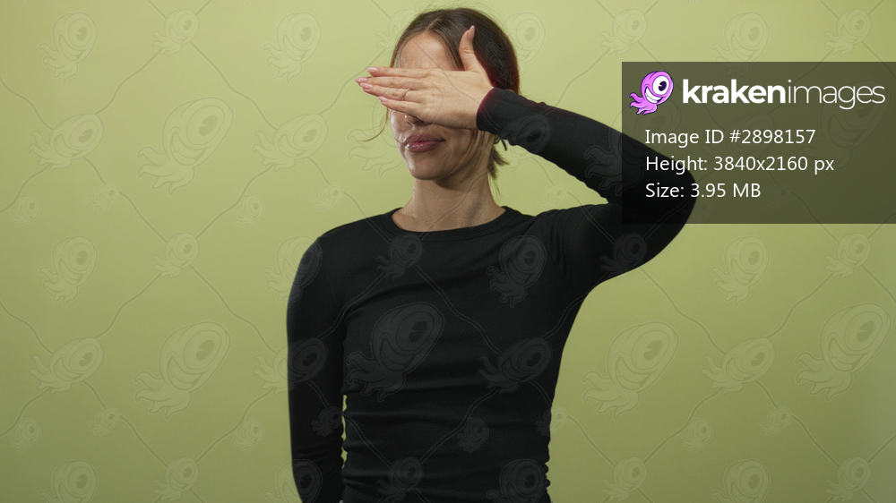 Young hispanic woman covering her eyes with hand and wearing a black top in green studio; shyness concealment solitude.