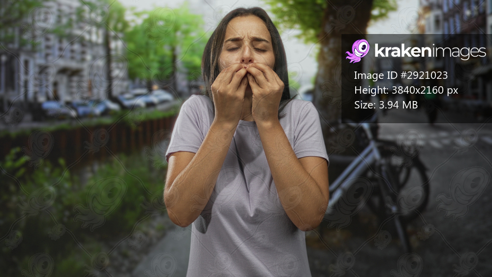 Young hispanic woman covering mouth with both hands and closed eyes on a city street by a canal with parked bicycles and trees; pain.