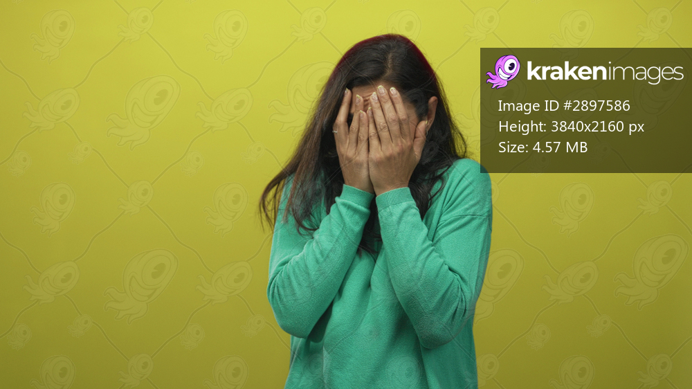 Young hispanic woman covering mouth with both hands in yellow studio, tense expression and wide eyes; fear vulnerability.