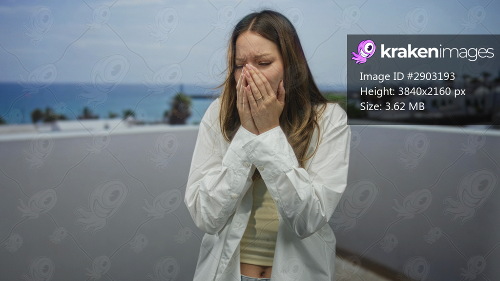 Young hispanic woman covering mouth and clutching chest on rooftop building terrace overlooking sea during daytime; anxiety.