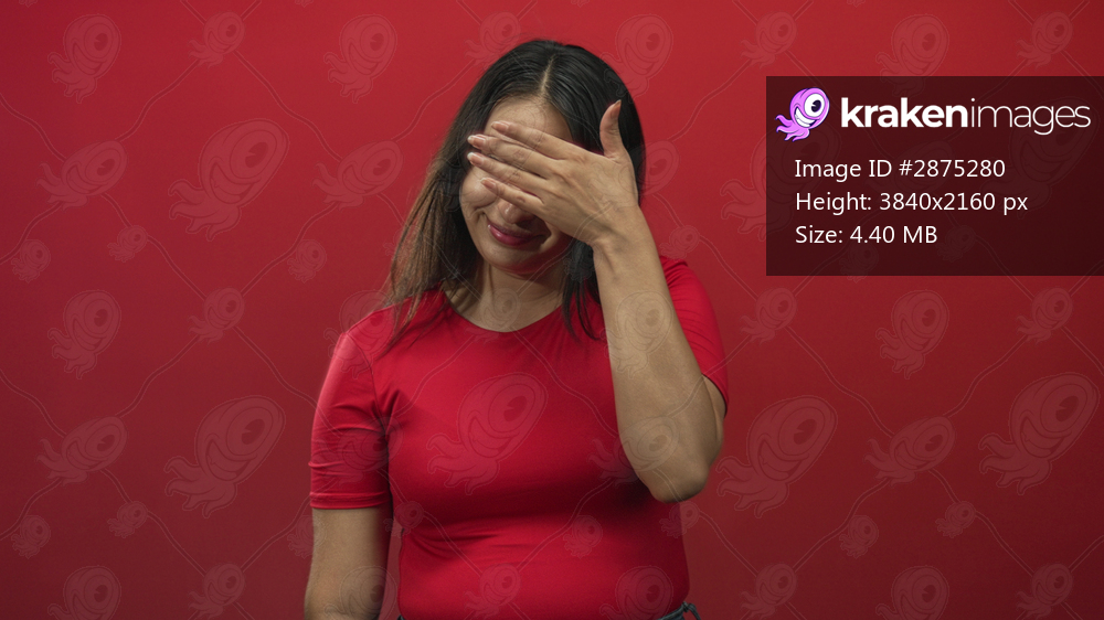 Young hispanic woman covering mouth with hand and closed eyes in red studio wearing red shirt; embarrassment introspection reflection.