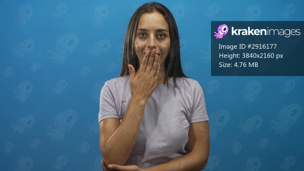 Young hispanic woman covering mouth with hand in blue studio, wearing light purple t shirt and crossed arms visible; surprise shyness coyness.