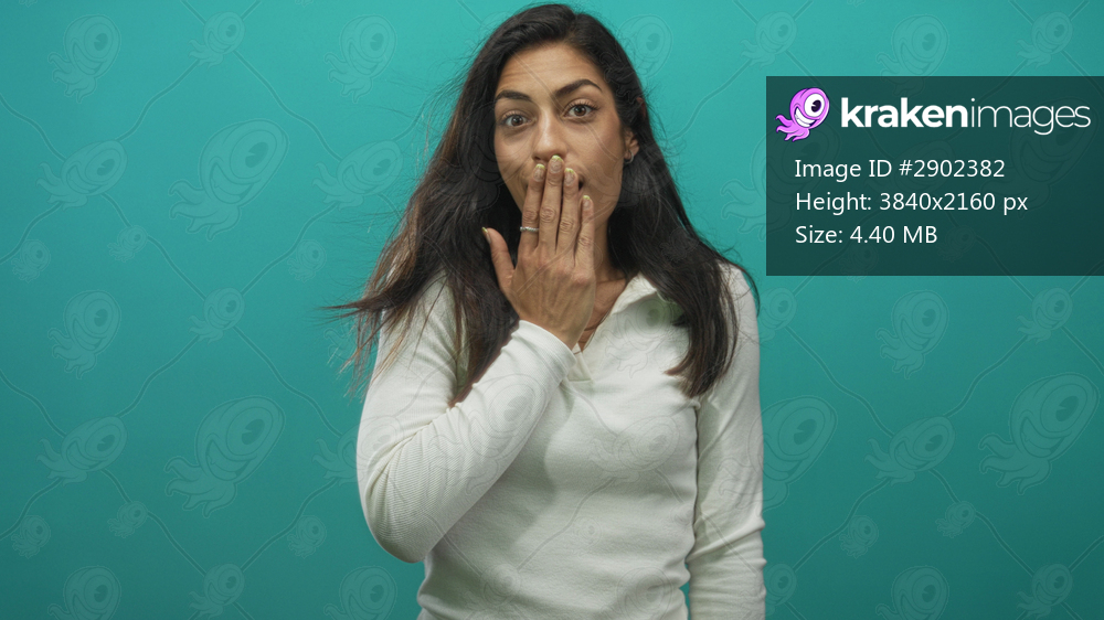 Young hispanic woman covering mouth with hand in studio turquoise backdrop, centered frame, surprised expression; surprise playfulness.