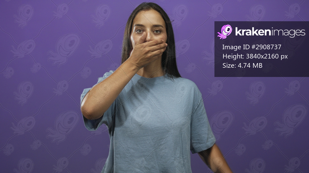 Young hispanic woman covering mouth with hand and pointing thumb to herself in a purple studio; silence secrecy.