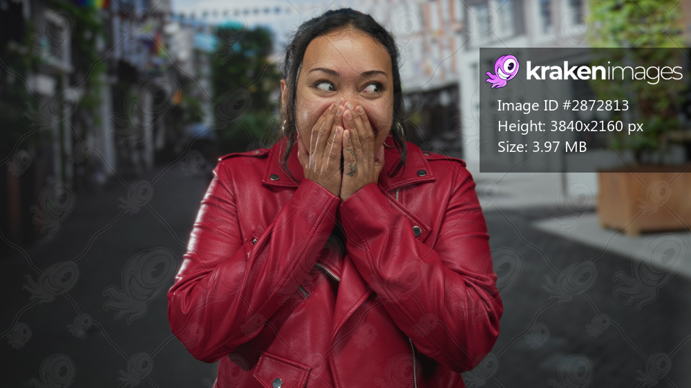 Young hispanic woman covering mouth with hands on city street in red leather jacket, wide eyed and laughing in surprise; surprise discovery.
