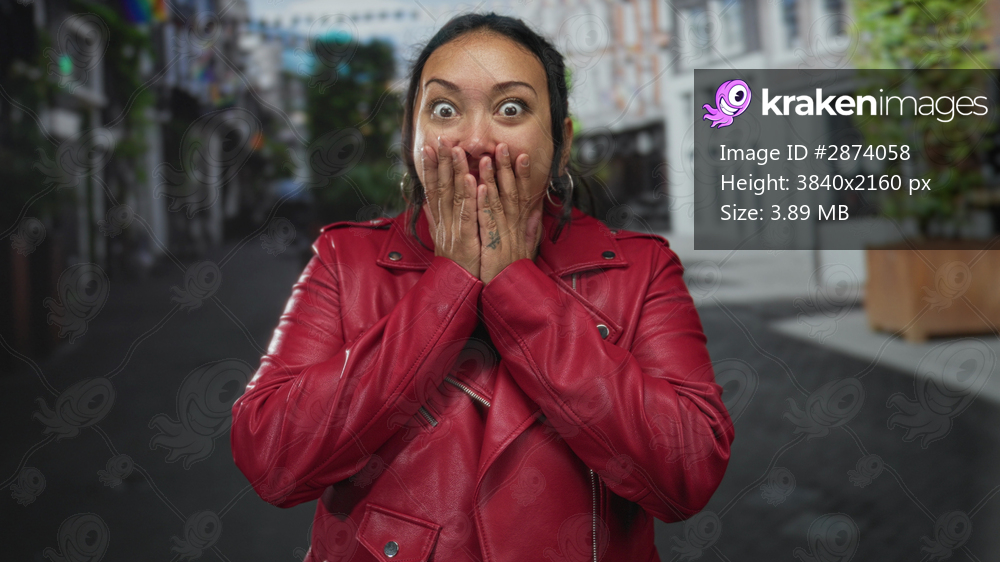 Young hispanic woman covering mouth with hands on city street in red leather jacket, wide eyed and laughing in surprise; surprise discovery.