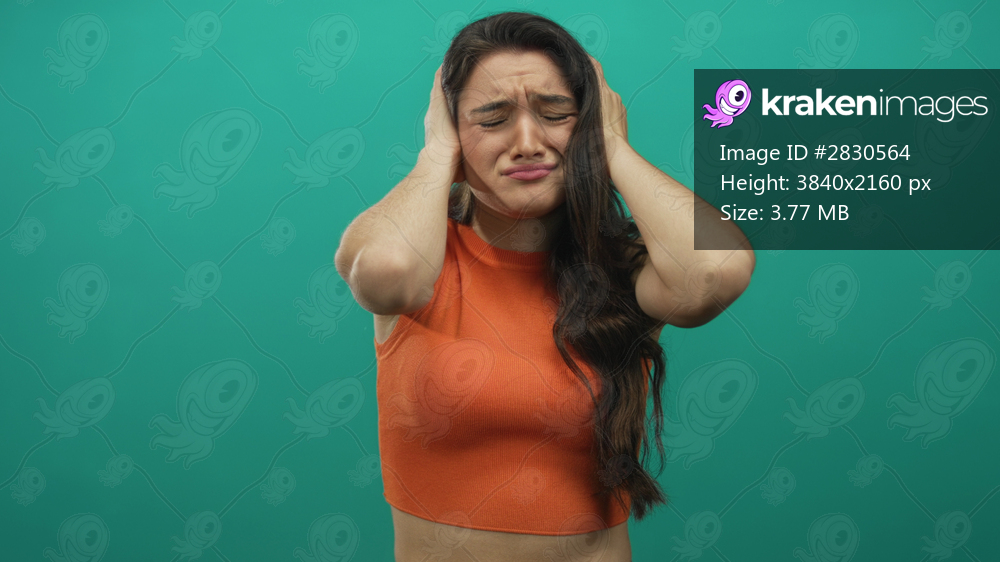 Young hispanic woman covers ears with hands and presses palms against head in teal studio; distress.