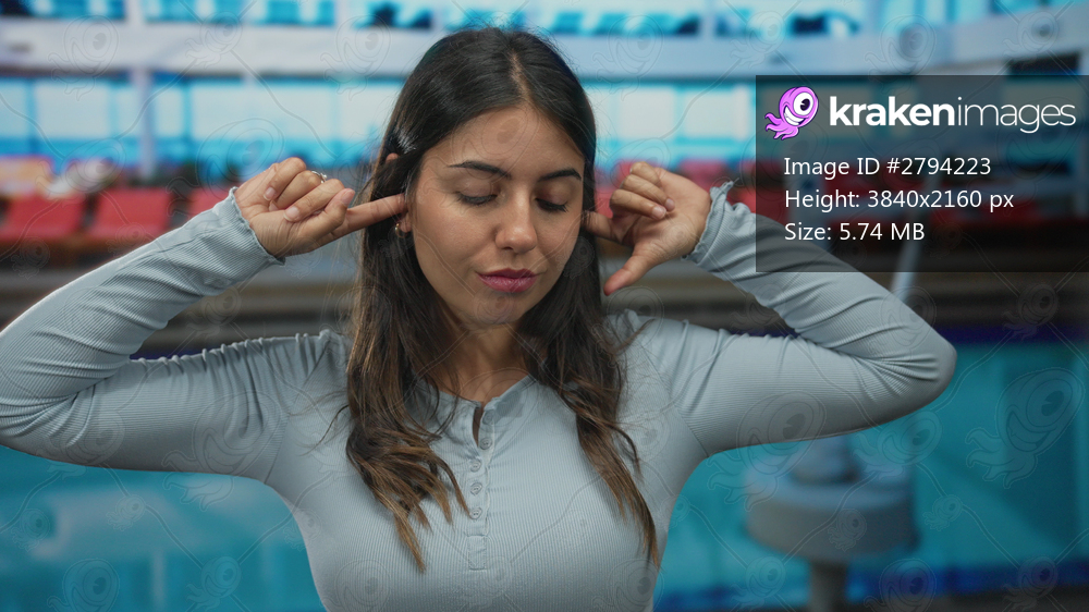 Young hispanic woman covers ears on boat dock during daytime ferry ride past red benches and white railings; annoyance.