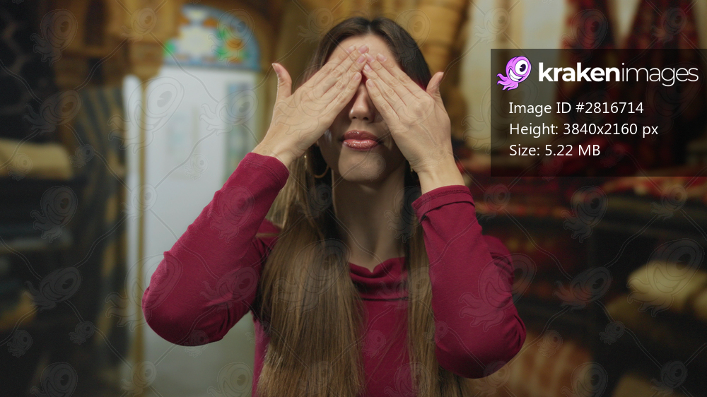 Young hispanic woman covers eyes with hands in brightly lit building lined with carpet rolls; anticipation.