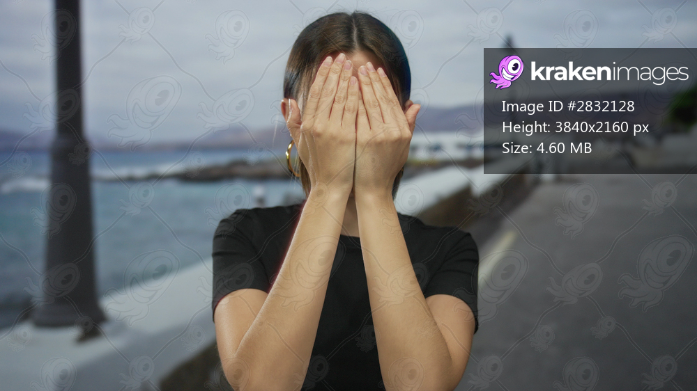 Young hispanic woman covers eyes with palms on a seaside street promenade at sunset; surprise curiosity.
