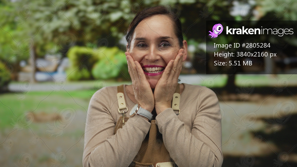 Young hispanic woman covers face with hands in lush green park outdoors; surprise happiness playfulness joy.
