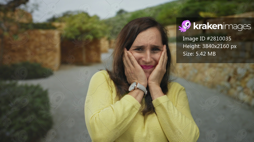 Young hispanic woman covers face with hands in stone courtyard; fear anxiety distress vulnerability.