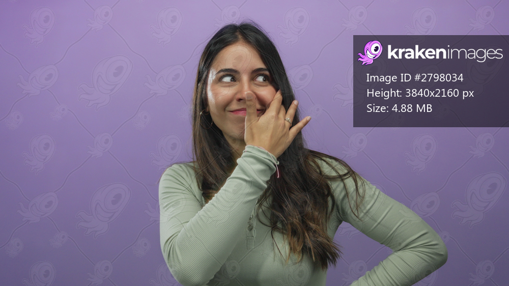 Young hispanic woman covers her face with a hand wearing rings against an isolated purple background wall showing an expression of surprise or shyness. - Kraken Images