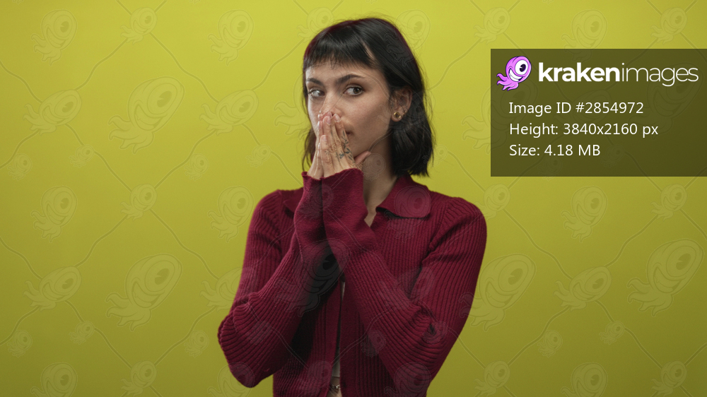 Young hispanic woman covers her mouth with her hands in a bright yellow studio setting; surprise tension.
