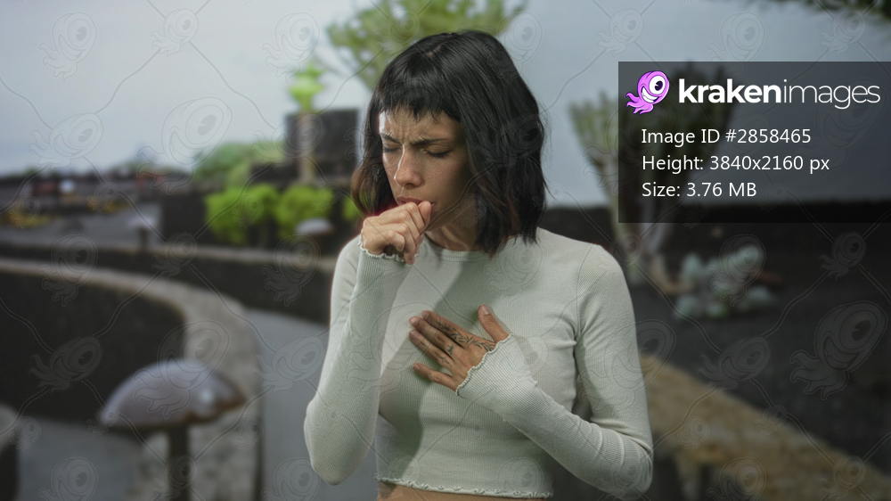Young hispanic woman covers mouth with hand while coughing on street; health concern vulnerability.