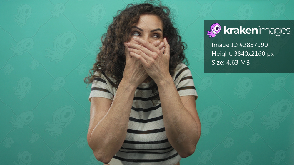 Young hispanic woman covers mouth with hands in teal studio with wide eyed shock gesture and raised eyebrows; surprise.