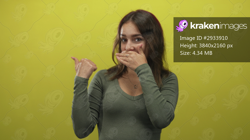 Young hispanic woman covers mouth with right hand and points thumb to chest in lime green studio; surprise reaction.