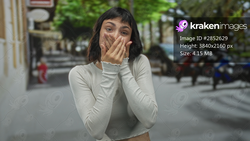 Young hispanic woman covers mouth with tattooed hands on a busy street lined with parked motorcycles and leafy trees; shock.