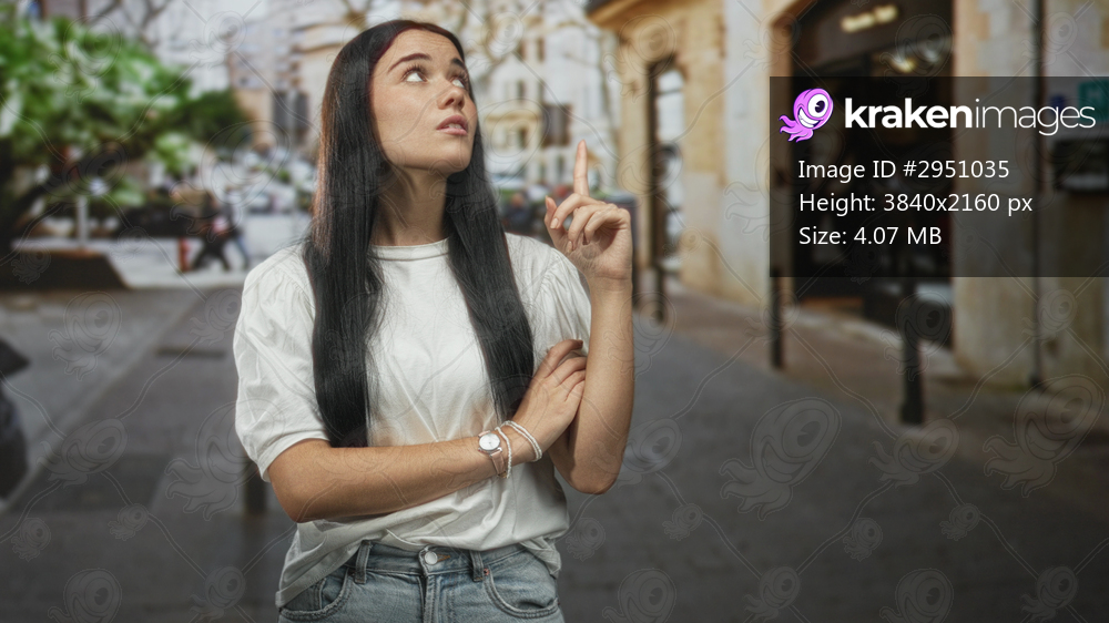 Young hispanic woman with crossed arms pointing index finger upward showing wristwatch on a busy cobblestone city street; confidence poise.